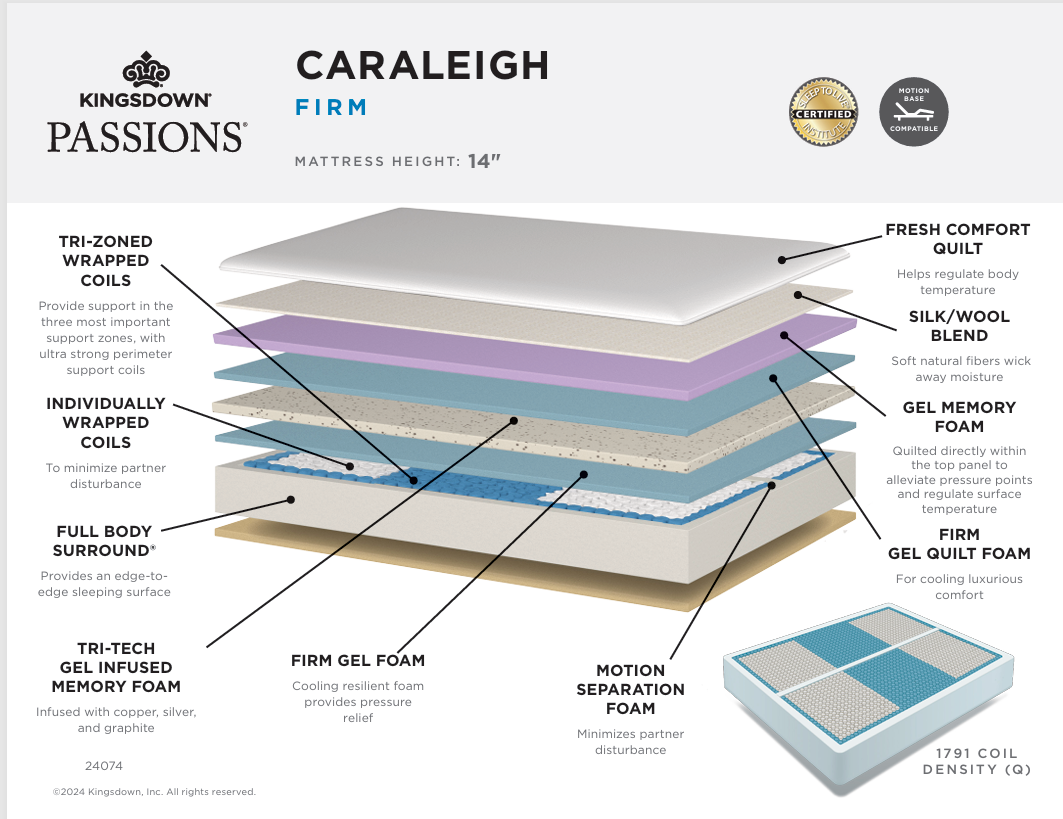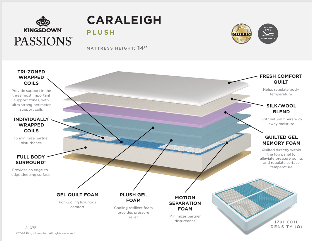 From cover to core, the Passions Collection gel-infused performance fabric, cushioning layer and individually wrapped coils delivers superior comfort and support. Passions mattresses combine the most advanced technologies and comfort enhancing materials for cooler, revitalizing sleep.