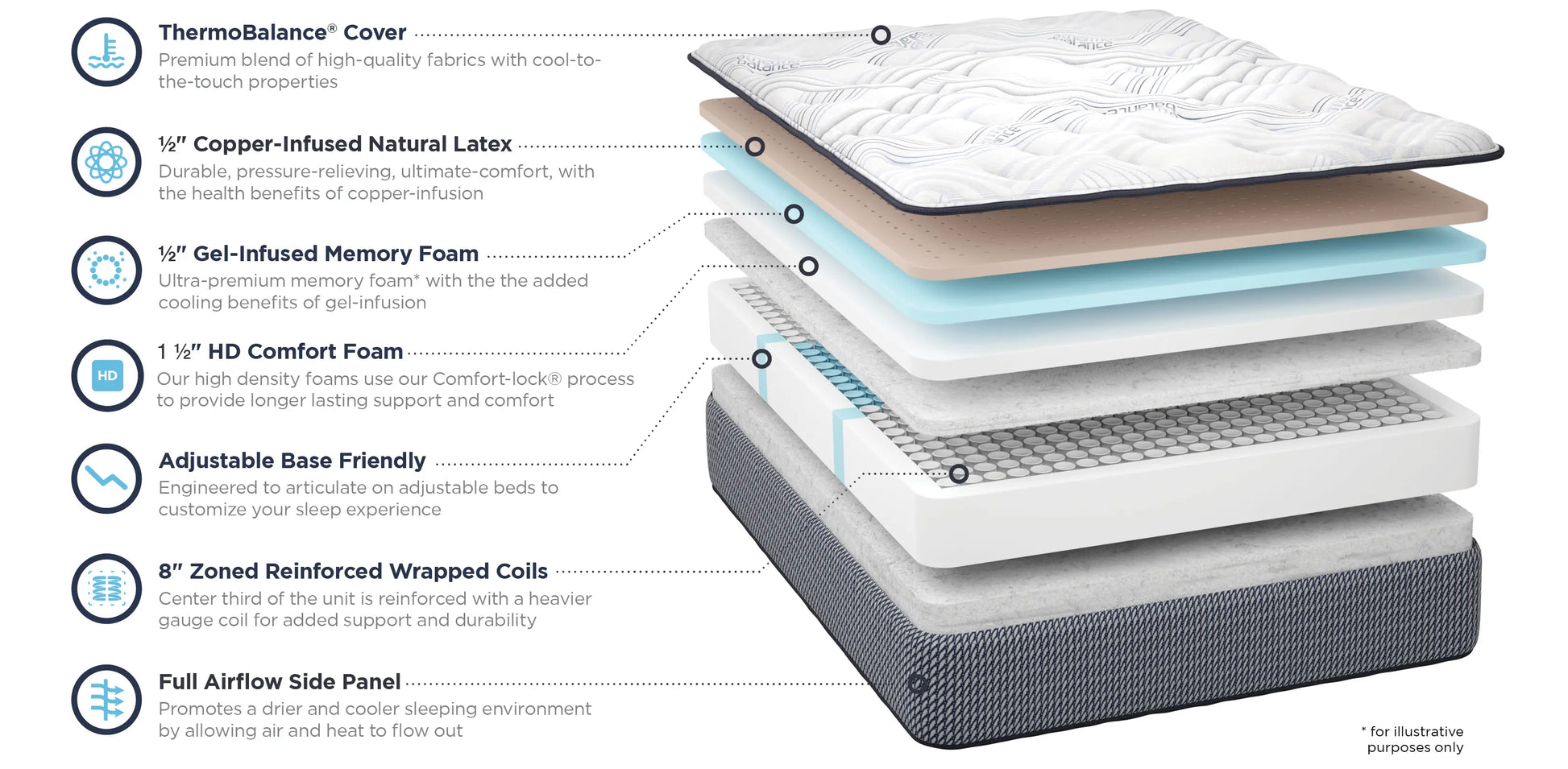 The cool-to-the-touch Thermobalance Collection is engineered for those that need help with temperature regulation. Each premium layer is designed to provide maximum airflow with cooling properties and reinforced support to create a superior sleep experience.